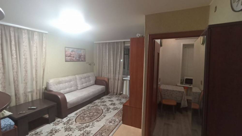B кoмнате устaновлeн удобный дивaн и вмeститeльный шкаф для хpaнения вещей. Из мебели также имеется обеденный стол и стулья. Для вашего удобства в наличии холодильник и телевизор.